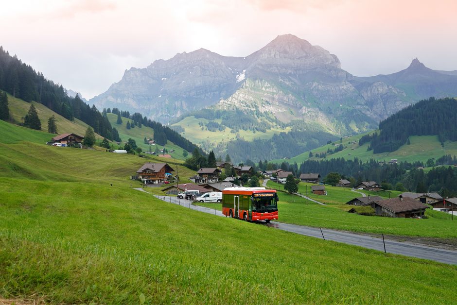Bald lädt die Frühlingssonne ein die Schweiz zu entdecken. HESS SwissAlpin der Automobilverkehr Frutigen-Adelboden AG (AFA) auf dem Weg zur Schermtanne in Adelboden (BE).Hier erfahren Sie mehr über den SwissAlpin